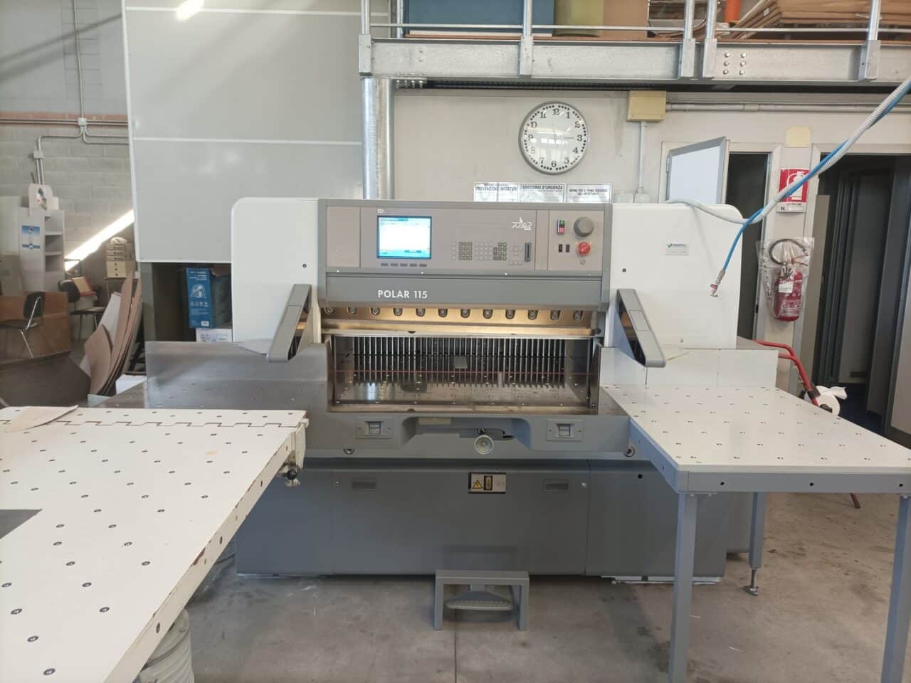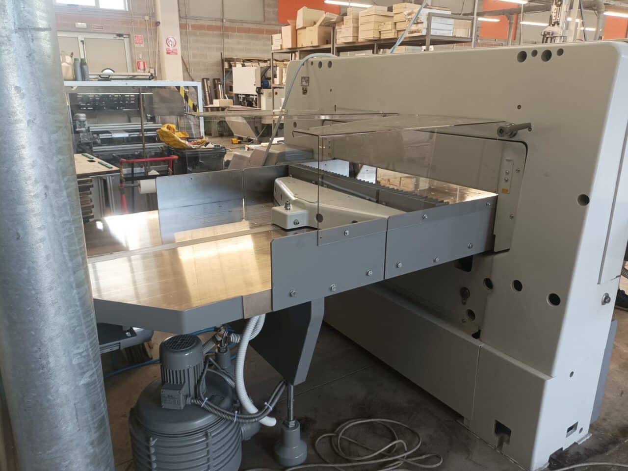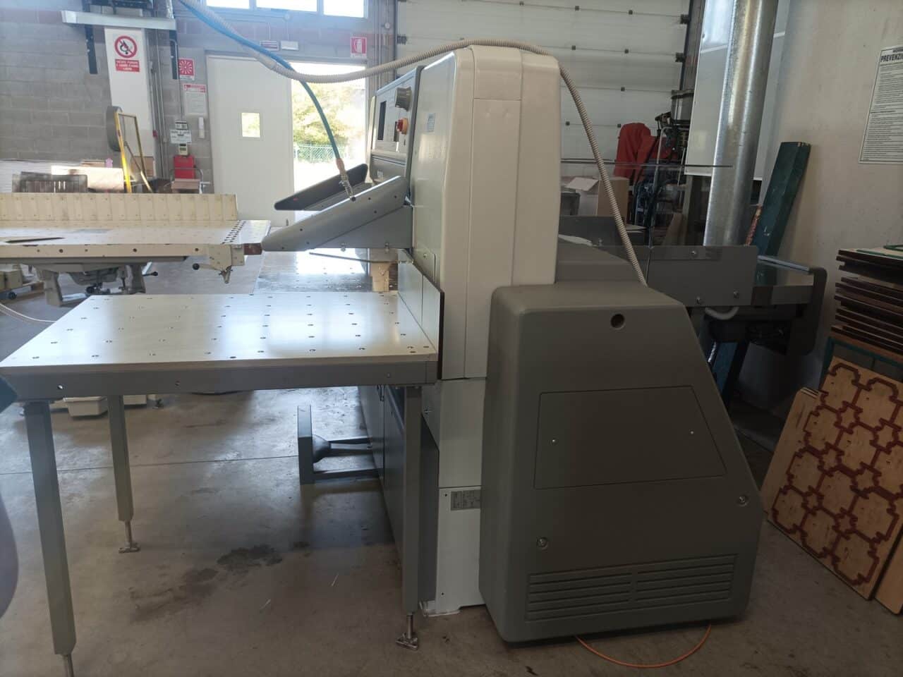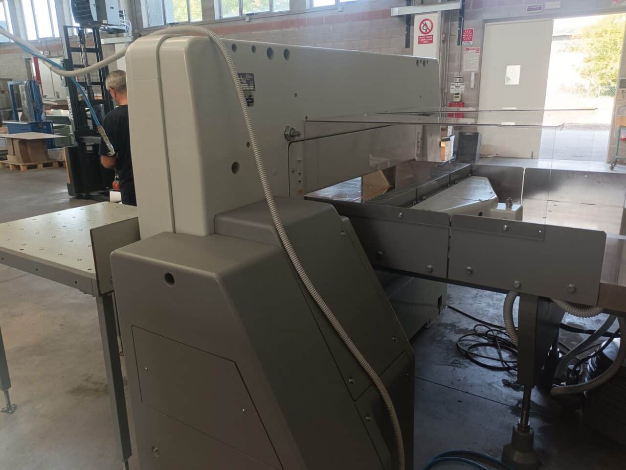 Il tagliacarte è stato venduto a norma, con fotocellule e coperture di sicurezza, lame affilate, chiavi di dotazione e manuali di istruzioni, con l’aggiunta dei piani maggiorati in formica 100×100.