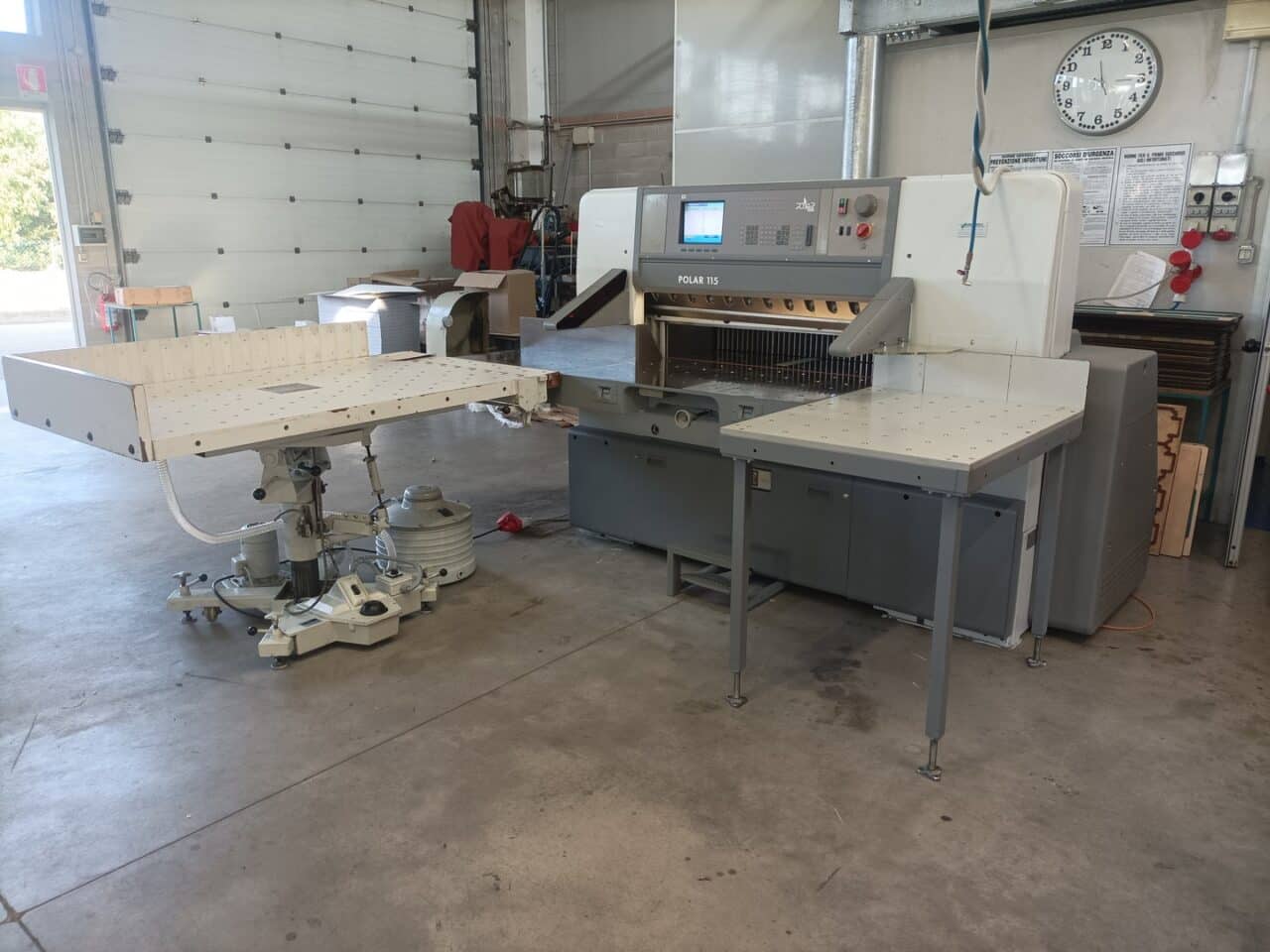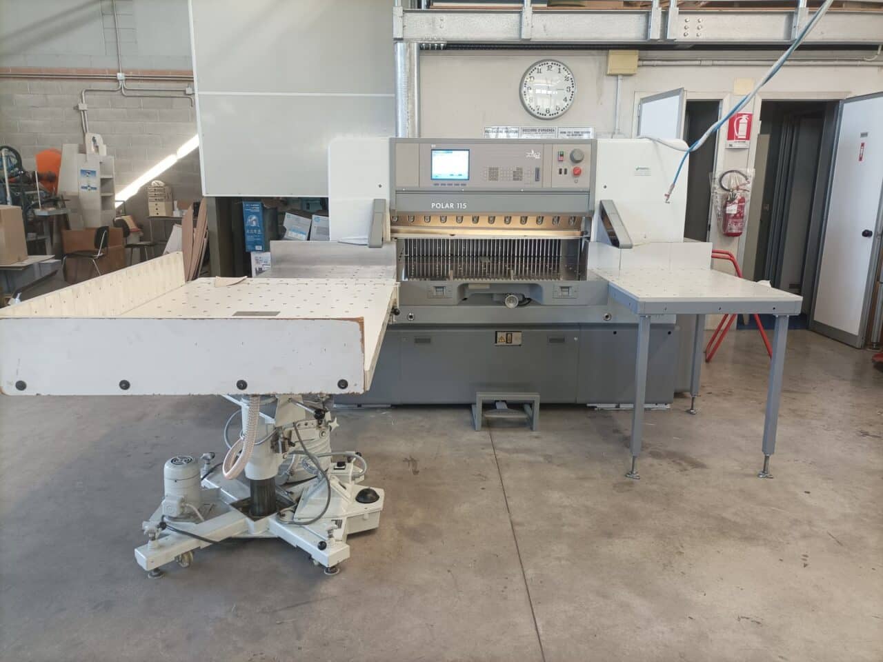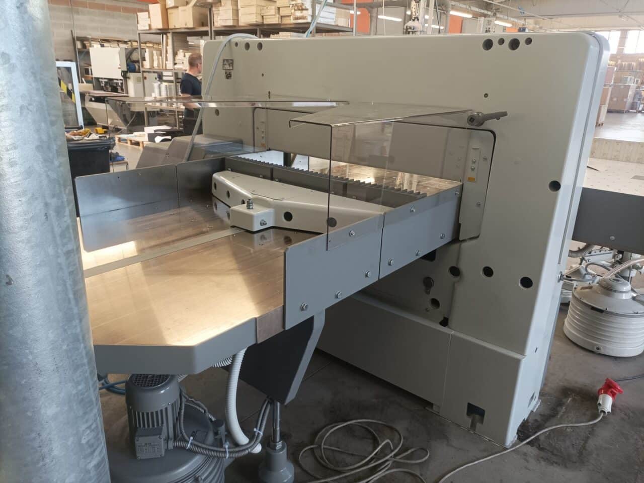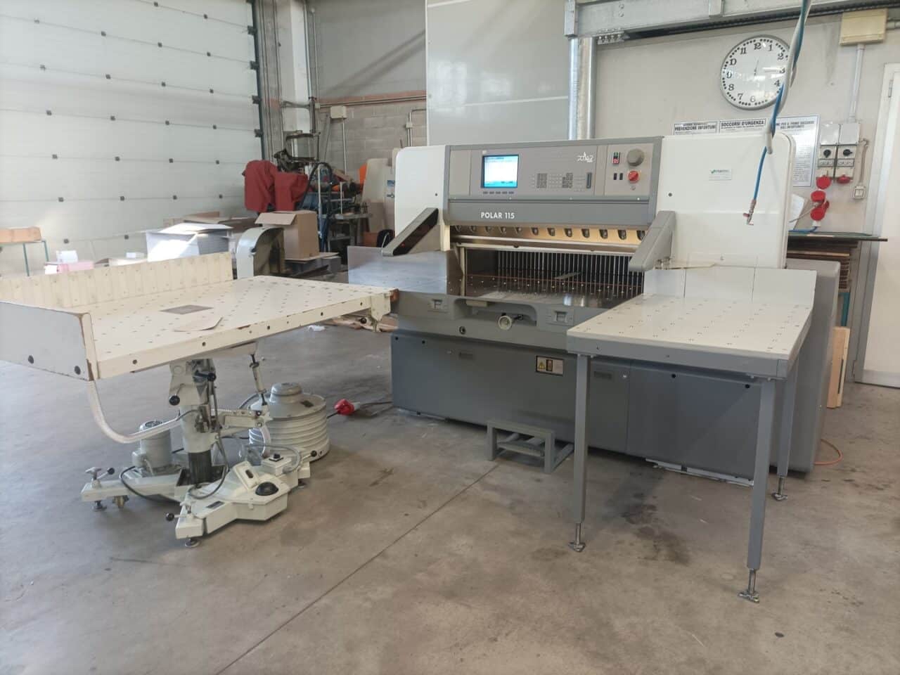 Il tagliacarte è stato venduto a norma, con fotocellule e coperture di sicurezza, lame affilate, chiavi di dotazione e manuali di istruzioni, con l’aggiunta dei piani maggiorati in formica 100×100.