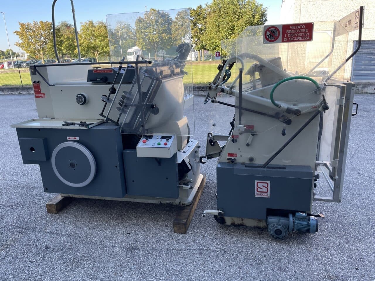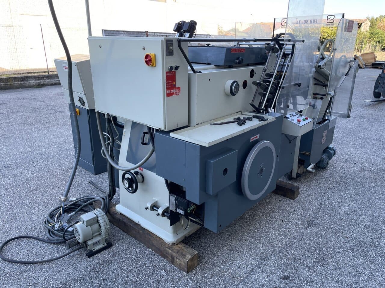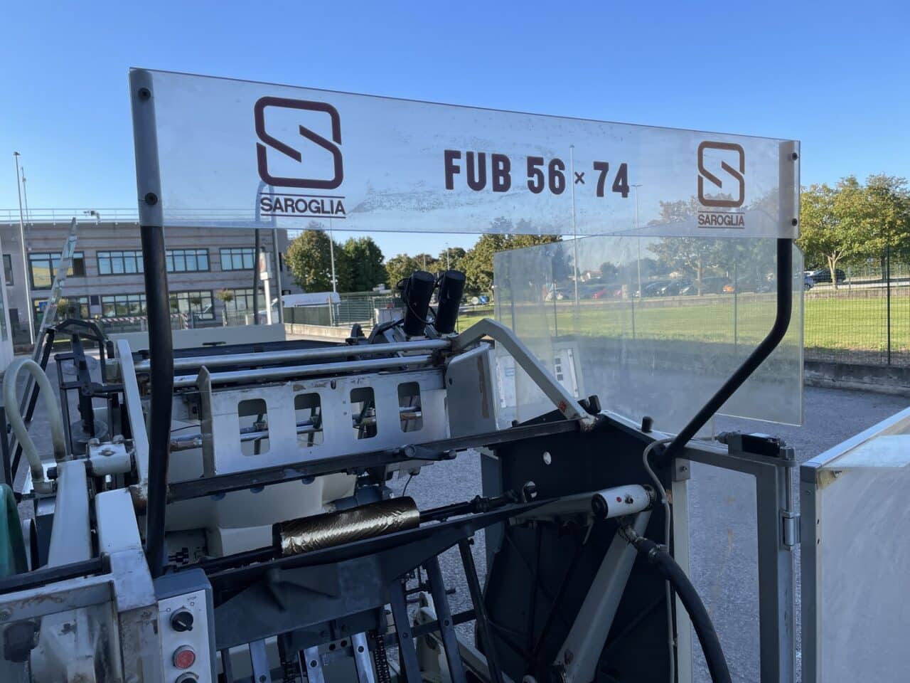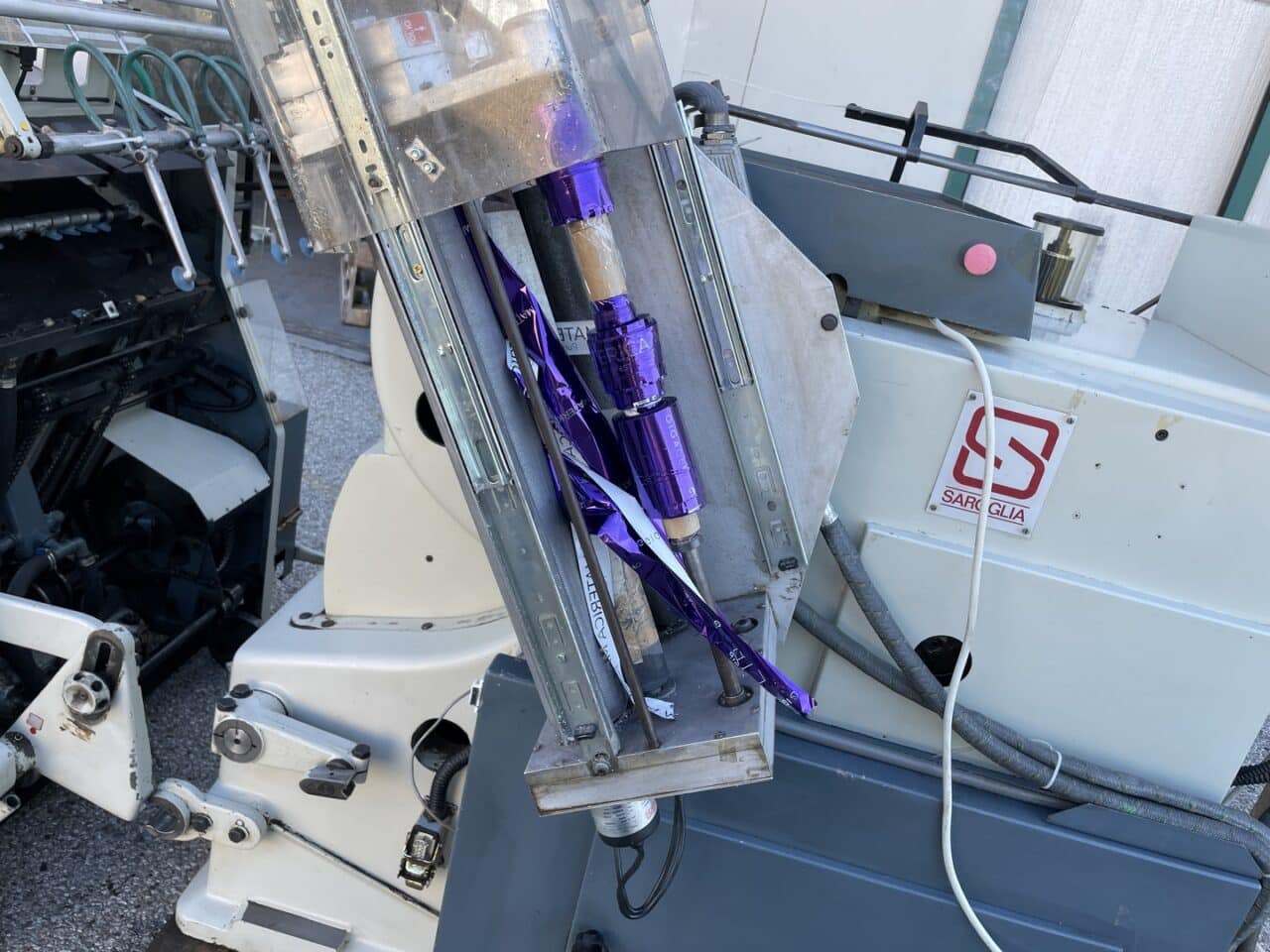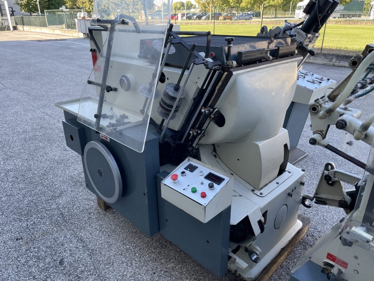 Platina fustellatrice con mettifoglio automatico Saroglia modello FUB 56×74 con dispositivo di stampa a caldo.